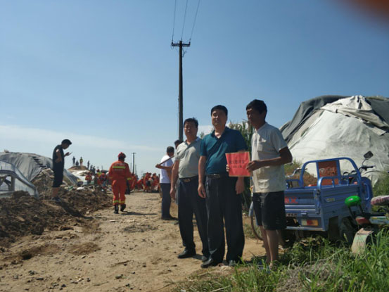 2018年8月14日以來,受“摩羯”、“溫比亞”雙臺風(fēng)影響,我市連降特大暴雨,加之上游水庫大流量泄洪,致使紀(jì)臺、稻田、上口、營里、羊口等鄉(xiāng)鎮(zhèn)部分村莊遭受大災(zāi),我單位11戶職工家中大棚受淹或家中進(jìn)水,給其造成不同程度的經(jīng)濟(jì)損失。其中孟永勝、張世威2名職工老家大棚進(jìn)水倒塌,損失慘重;李金輝、常文亮2名職工大棚進(jìn)水,作物絕收;周華欽、李鵬、楊新國、韓曉亮、郝慶濱、張靜、王建偉7名職工老家河水倒流,屋內(nèi)積水,有的還造成地基下陷,損失嚴(yán)重。