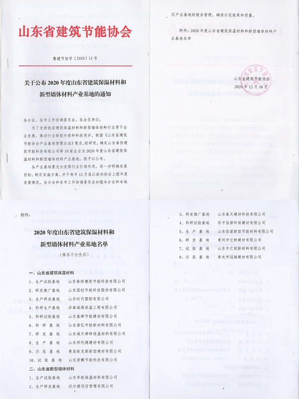為了支持山東省建筑保溫材料和新型墻體材料行業(yè)骨干企業(yè)發(fā)展,推動行業(yè)轉(zhuǎn)型升級和科技進步,根據(jù)《山東省建筑節(jié)能協(xié)會產(chǎn)業(yè)基地管理辦法》要求,山東省建筑節(jié)能協(xié)會確定我公司等18家企業(yè)為2020 年度山東省建筑保溫材料和新型墻體材料產(chǎn)業(yè)基地。